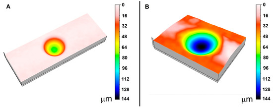 Three-dimensional wear scar topographies corresponding to (A) α-β20T and (B) TC3030 ceramics after the 900 s tribotest.