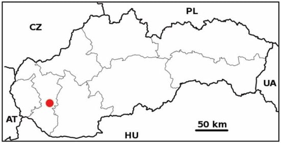 In the second half of the last century, nickel ore was processed near the town of Sereď (SW Slovakia, Figure 1), where the landfill waste of black mud (waste from the colour metallurgy of nickel and cobalt) is a direct evidence of this activity. The tailing is 45 m high, 800 m long and 550 m wide (Figure 2). In the south, west and east, it is in contact with agricultural land and represents a significant anthropogenic barrier []. It is a distinct anthropogenic form of relief with a typical convex unit (Figure 2). The site is noncombustible and has a distinctive shape of a tabular terrace, which was formed by the gradual deposition of waste layers—black nickel mud. It has steep slopes of up to 45 degrees (anthropogenic table mountain). According to a field survey by Michaeli et al. [], the landfill waste has high permeability; therefore, rainwater quickly penetrates the lower layers, and the remaining water evaporates quickly since the black nickel mud strongly absorbs sunlight and thus rapidly overheats.