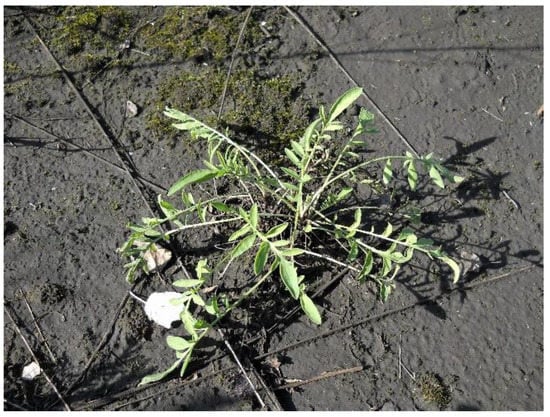 Diplotaxis muralis (Figure 5, annual wall-rocket—therophyte []) is an annual, biennial, rarely perennial herb, 15–50 cm tall. It inhabits mainly rubbles, fields, fallows and vineyards; it also occurs along roads, on landfills, ruderalized lawns, composts and various anthropogenic habitats. It occurs mostly on clayey or gravelly, nutrient-rich soils []. It is originally widespread throughout Central and Southern Europe (up to Northwest Africa), secondarily it occurs in Northern Europe, in parts of Russia and northern China, in South Africa, as well as in Australia and Tasmania, New Zealand, New Mexico, in almost the entire United States and southern Canada, and Central and South America []. In Slovakia, it is a common species, especially in warmer areas and in habitats with mild to medium soil moisture.
