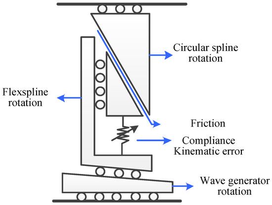 Harmonic drives (HDs), which were invented in the 1950s [1], are well known for their high gear-reduction ratio, low weight, small volume, lack of backlash, and high efficiency [2]. Therefore, HDs are used widely in intelligent robotics and various high-tech fields [3]. Many studies have been conducted on HD kinematic error [4], nonlinear stiffness [5,6,7,8,9,10], hysteresis [8,10,11,12,13,14,15,16], and dynamic friction [17]. However, no definite understanding of the mechanism of transmission compliance and hysteresis behaviors or their degradation is available in the literature. In previous works, the HD is considered to be a black box or grey box, which causes the accuracy of the HD model to degrade over time.