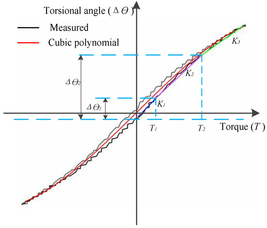 where K1, K2, and K3 are the stiffness; and T1 and T2 are the torque given by the manufacturer. Another method of estimating the nonlinear stiffness uses a cubic polynomial approximation [12]. The third-order polynomial function is given by: