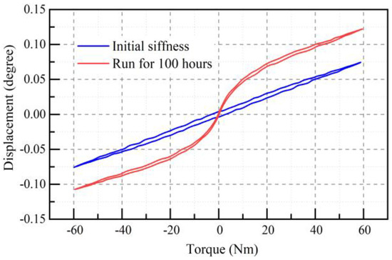 Equations (22) and (23) capture the degradation of this behavior in the proposed model. Figure 7 shows that the initial transmission compliance and hysteresis in HD had the symmetric property, but the reducer did not have such properties after 100 h of operation. This is most likely because the test was conducted in one direction. Figure 7 also shows that the reducer hysteresis at zero load torque decreased and tended toward zero after 100 h of testing. This is because the tooth surface interference disappears due to wear, and the no-load preload is zero. Therefore, the micro-sliding friction that caused hysteresis is almost zero at no load. Furthermore, the transmission compliance shows obvious nonlinearity, especially in the range of small-load torque.