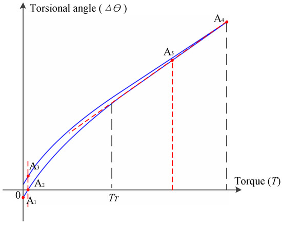 According to the model proposed in this paper, the nonlinearity of transmission compliance is caused by the FS teeth. When TFS > TT, the rigidity of the FS tooth is constant, the transmission flexibility of the reducer is linear. Therefore, the threshold value TT can be obtained by the method shown in Figure 9. A trial and error method can be used to estimate the parameters of the proposed HD model. The μ and cTi take initial values as μ0 and (cTi)0. As shown in Figure 9, five points (Ai (Ai1, Ai2) i = 1, …, 5) are selected for parameter evaluation. Considering the test error, the average value can be obtained through several tests. Model parameters can be estimated as follows: