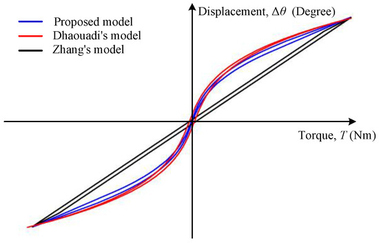 The torque-displacement curve of the Zhang’s hysteresis model given in Appendix B, the Dhaouadi’s hysteresis model given in Appendix A, and that of the proposed model are shown in Figure 11. In Zhang’s model, the behavior of the HD’s rotational compliance was described by the behavior of a serial spring-mass system. They assumed that the linear spring (a) represents the WG compliance, the linear spring (b) represents the FS compliance, and hysteresis is caused by constant friction Ff. It can be shown that Zhang’s model cannot capture the nonlinear flexibility of a harmonic drive, and the hysteresis curve is independent of the load torque. In Dhaouadi’s model, they used the hereditary concept to represent the hysteresis behavior of the HD, and an analytical odd polynomial function was selected for the stiffness curve. It is important to observe that the hysteresis represented by this model decreased with an increase in load. Therefore, as shown in Figure 10, this model cannot accurately capture the hysteretic behavior of the harmonic reducer after degradation. Compared with the above models, the proposed model considers the influence of the multi-tooth engagement and interference characteristics of the HD on the transmission flexibility and hysteresis. The proposed model can capture the degradation of nonlinear stiffness and hysteresis behaviors of HD.