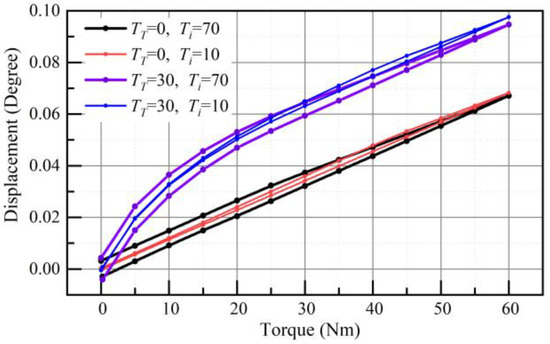 Figure 12 shows an analysis of the effects of interference and multi-tooth meshing on the behavior of the HD. The hysteresis was clearly affected by the preload caused by the interference. At zero torque output, hysteresis decreased as preload decreased. This explains why the hysteresis decreased as the running time increased (Figure 7). Figure 12 also shows that the nonlinear stiffness of the reducer is attributed to the number of meshing teeth, which depends on the load. The number of meshing teeth reached the maximum (TT = 0) due to initial interference. Therefore, the initial stiffness was linear (Figure 7). With an increase in wear, the initial no-load tooth interference vanishes gradually, and TT increased from zero. The transmission compliance of HD shows nonlinear characteristics gradually. This is consistent with the test results shown in Figure 7.