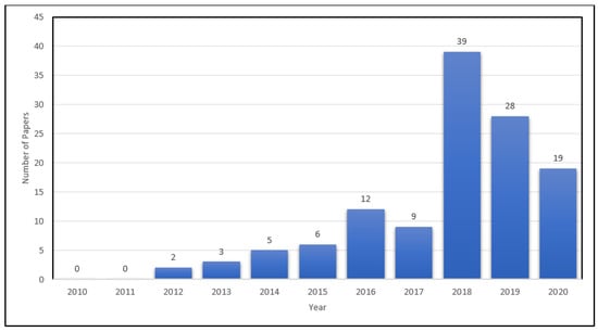 - The search results are filtered by year, in a decreasing order starting with the year 2020 until the year 2010. For each year, the search results are examined page-by-page of minimal 15 search results pages, even though the topic of the searched papers no longer show any relevance to the scope of the study. Otherwise, the search continues in the ongoing pages until no more topic of relevance is obtained in the search. This process is repeated for the year 2020 at three days interval throughout the search duration in order to ensure that any related work is included in the study. In addition to the papers in [], the search duration lasted for close to six months (May 2020–October 2020) while reviewing the collected papers in parallel.