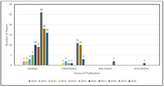 Various sources contributed to the material collection. This mainly includes journals and conference papers, followed by two Ph.D. theses and a technical report. No relevant literature could be found in the years 2010 and 2011, due to the specific scope and filters that are applied. Some potential papers are dismissed due to the vagueness of the VRP’s application in the presented work, resulting in the remaining 123 papers that contributed to this study. The papers segregated by year are observed in Figure 1, which could be further narrowed down into the type of sources, as depicted in Figure 2 and Figure 3. Table 2 then presents a detailed distribution of the sources over the scope of 2010–2020.