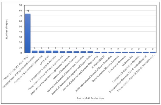 From Figure 1, it could be briefly said that the interest in publishing papers addressing the application of VRPs in classified humanitarian operations is gradually increasing from the year 2012 and reaching its peak in the year 2018. The same trend could also be seen in each of the sources of publication type namely the journal and conference proceedings. (Figure 2). When considering all of the sources of publications individually, it could also be observed that each publication contributing roughly to the same amount of papers, ranging from the value of 1 to 4. Thus, no clear source of publication is seen dominating the scope of this review by a large margin. Finally, it could be said that the papers that are published in journals contribute to roughly twice the amount of conference papers, suggesting a healthy amount of comprehensive work published when compared to preliminary studies.