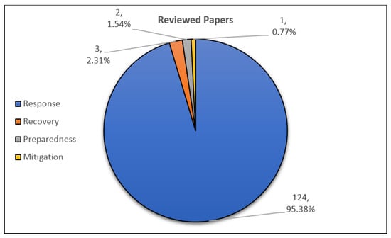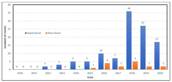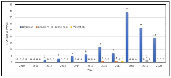 These three applications of VRP in humanitarian operations are further detailed by specifying which disaster phase that each paper addressed in the second stage of classification. These phases are classified into four categories, as proposed by [] and applied worldwide: (1) Response, (2) Recovery, (3) Preparedness, and (4) Mitigation, under Disaster Phase (DP). Furthermore, disaster type is also included for classification labelled as “Typ” consists of: (i) rapid onset disaster and (ii) slow onset disaster. Through these additional classifications, specific insights in terms of trends could be obtained in relation to the nature of disasters addressed as well as the DM perspectives of the selected humanitarian operations.