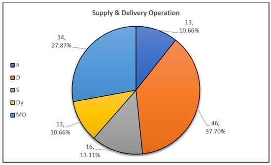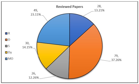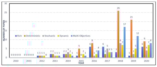 In terms of attribute 3, the papers are further classified based on the modelling aspect of complex or rich (R) VRP, deterministic (D) VRP, stochastic (S) VRP, dynamic (Dy) VRP, as well as multi-objective (MO) VRP. Ref. [] is referred to for the definition of the stochastic and dynamics in the classification. Meanwhile, the definition of RVRP is based on []. However, the extended and complex version of typical variants of VRPs, such as CVRP, VRPTW, and VRPPD, are also considered to be rich. The classification of RVRP resonates well with the suggestions from [,,] and ref. [], which emphasised the importance of RVRP. The DVRP is also included in the classification due to the large number of papers collected addressing such routing problems. Moreover, the classification for DVRP is added in order to investigate the possible trend of research within the context of this study. As is often included in other review papers, the multi-objective attribute of modelling is also of importance and applied in many review papers. As such, the classification for this attribute is also performed.