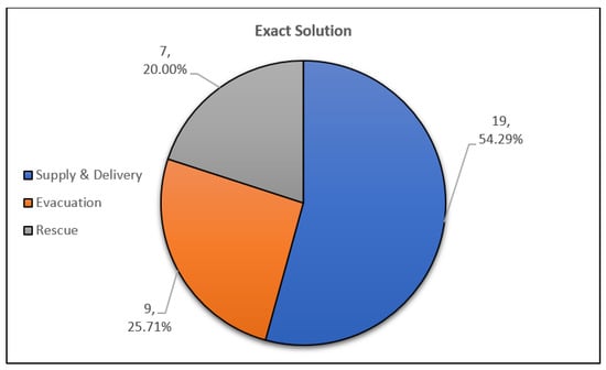 A more detailed model of delivering supplies in a disaster event that is addressed by the exact solution approach is shown in []. The Mixed Integer Programming (MIP) model highlights an interesting concept of sharing relief supply among emergency shelters. This concept works by allowing for sharing according to the assigned priorities as well as the number of evacuees. Ref. [] addressed the problem criteria based on the Japan government’s white paper on the Great East Japan Earthquake in 2011. The objective of the model is to minimise the total transportation cost as well as the penalty that is imposed for every failure in satisfying the demand. The goods’ priority are represented by each weight that is associated with the good types. Unlike the typical VRP model, shelters that have homogeneous delivery cars with fixed capacity take the role of a depot, while also having their own demand. As such, the sharing concept among shelters could be modelled. Furthermore, each shelter is also associated with priority according to urgency. Here, real data of Chofu City in Japan are applied to generate real data for the parameter of the problem. The CPLEX solver is utilised for solving the problem.