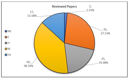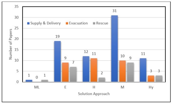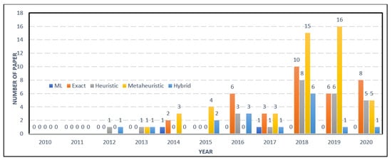 The final attribute 4 addressed the solution approaches that were adopted by the various papers. Within the scope of this study, a hybrid (Hy) solution is defined as a cross combination in regards to algorithm operators among ML, heuristic (H), metaheuristic (M), and exact solution (E). ML is defined as a solution approach that requires an agent to learn for optimal or sub-optimal decisions or policy, based on supervised, unsupervised, or reinforcement learning. On the other hand, the exact solution approach is defined as a solution that can be solved based on an existing commercial solver, such as CPLEX, Gorubi, and GAMS, which looks into all possible solutions in producing an optimal result as opposed to the sub-optimal results. We note that such a platform also provides heuristic and metaheuristic solution as a choice and took notes on the difference between algorithms, such as branch and bound, and other available solution approaches when making this review. The well-known standard definition of heuristic and metaheuristic is used in the classification ([,], respectively).