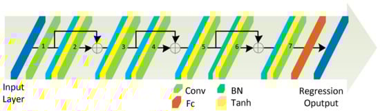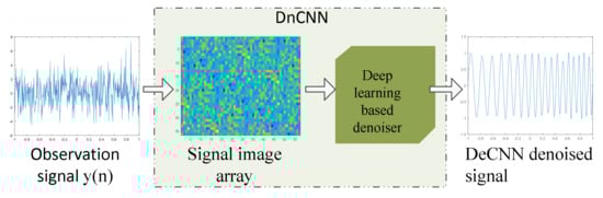 The overall framework of DnCNN is shown in Figure 2 and Figure 3. We modify the ResNet [34,35] to make it suitable for the reshaped signal image array denoising as shown in Figure 3. Unlike the residual network that uses many residual units (i.e., identity shortcuts), our DnCNN employs three single residual units to predict the latent clean signal. With such a residual learning strategy, the network can be easily trained and help ease optimization [35,36].