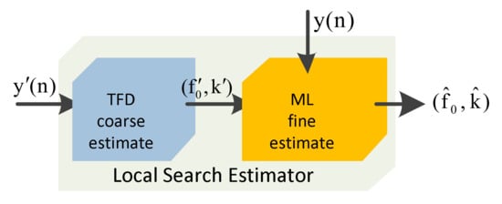 After denoising, parameter estimation is performed by local search estimator using denoised signal and observation . As shown in Figure 4, the proposed approach consists of a TF coarse estimator, which uses TF distribution of to coarsely estimate the initial frequency and chirp rate , then an ML fine estimator applied on the and to get the fine estimation results of the initial frequency and chirp rate .