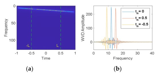 For an ideal chirp signal, its WVD is an impulse spectral line along its IF, finite length chirp signal’s WVD is dorsal fin shape as shown in Figure 5. We can see that the spectrogram of the chirp signal obtains the maximum value at the frequency point at each discrete time . Therefore, the IF of can be estimated by maximizing the spectrogram at each discrete time as Equation (3).