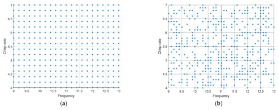 In our simulation, the number of sampling points of the observation is fixed to N = 513. The midpoint of the signal is the origin of time. The sample frequency is 256. There are only chirp signals and additive white Gaussian noises in the system without other interference or noise. The parameter change scopes of the training set and validation set are , , and 0.2 as an interval, as shown in Figure 6a. The parameter scope of the test set is the same as the training set, but the parameters are randomly generated, and accurate to one decimal place.