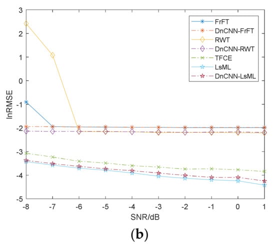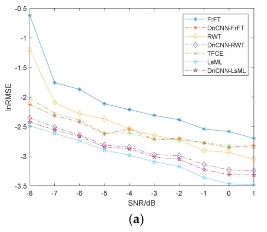 For simplicity, the proposed method is called LsML, TF coarse estimator is called TFCE. The estimator that uses denoised signal , as shown in Figure 7, is called DnCNN-XXX. We compare LsML with six other methods including RWT [8] and FrFT [15], which directly use the observation , TFCE, DnCNN-FrFT, DnCNN-RWT and DnCNN-LsML. Figure 8 compare the estimation performance of the above methods in estimating chirp rate and initial frequency . Here, the rotation angle of RWT is from 85 to 91 degrees with an interval of 0.01, the fractional power of FrFT is from 0.96 to 1.08 with an interval of 0.0001, the performance metric is the natural logarithm of Root Mean Squared Error, as described in Equations (10) and (11).