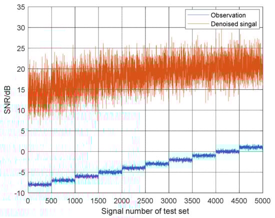 The SNR of the training set varies from –8 dB to –3 dB at an interval of 1dB. We randomly generate signals with the same parameter and k under the specific SNR as shown in Table 1. The parameter combination has covered all values within the parameter setting range. The validation set size is one-fifth of the training set. For the test set, we randomly generate 500 signals, and SNR varies from –8 dB to 1 dB for each signal as shown in Figure 6b.