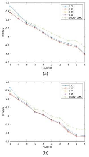 It can be concluded from these results that the proposed LsML has an excellent performance for chirp parameter estimation. By comparing the results of FrFT, RWT, DnCNN-FrFT, and DnCNN-RWT in Figure 8a, we can see that after DnCNN denoising, the accuracy of is significantly improved. This means that has a higher SNR than But by comparing the results of LsML and DnCNN-LsML in Figure 8a,b, we can see that observation is more suitable as input to the ML fine estimator. This means that after denoising of DnCNN, although the SNR of has improved a lot, as shown in Figure 9, the signal parameters have changed slightly. As analyzed before, the accuracy of TFCE determines the value of limitation width , which will further affect the performance of LsML. The impacts of different on estimation accuracy of LsML are shown in Figure 10a,b. We can see that when the SNR is very low, we need a high value of limitation width .