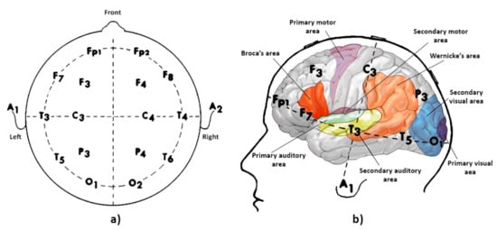The headset configuration consisted of 16 dry electrodes that recorded the signals in different areas of the brain. The channels used were namely Fp1, Fp2, F3, F4, F7, F8, C3, C4, T3, T4, P3, P4, T5, T6, O1, O2, according to the international 10/20 system. The decision to apply the electrode configuration to the entire head area was made based on the reasons given in Section 2. Since the research focused on the brain activity during an overt speech associated with visual stimuli it is important to capture the signals coming from areas of the brain not just the speech area. Figure 1b shows the side view of the location of the sensors use in our research and the iodine of the brain is shown. Due to the limited possibilities of positioning the electrodes on the Ultracortex EEG headset, we tried to cover the following areas: Speech areas (Broca’s and Wernicke’s area), Auditory areas, Visual areas and Motor areas. Another reason to use EEG signals coming from multiple areas is that, despite the well-known knowledge that Broca’s and Wernicke’s areas are located on the left hemisphere in about 95% of right-handers and 70% of left-handers [15], observations in the previous experiment [8] did not show a significant improvement for the machine learning based on the modeling with left hemisphere EEG signals. The experiment in Reference [14], showed that the classification of EEG signals from the left hemisphere shows just slightly better accuracies compared to signals from the right hemisphere signals classification.