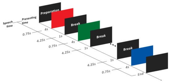 An acquisition protocol for EEG signals recording was partly inspired by the experiment in Reference [7]. The acquisition protocol was designed to activate the speech, visual and imaginary areas of the brain. EEG signals recording was performed in two sessions, each lasting about 10 min. In the first session specific colours were displayed on the screen as pictures, while in the second session, the colours were displayed as text on the screen. The recorded subject was tasked to focus on the displayed colours and to name them. In the first session the focus was on the activation of the subject’s imaginary areas of the brain. These areas help to create the image form of the word or to transform the seen image into a verbal form. The second session of the experiments was focused on activating the area of the brain responsible for understanding the written text, where the written text is transformed into a verbal form and vice versa. In the above exercise, 10 easily distinguishable colours were displayed randomly one by one with short breaks represented by a plain black colour. The colours spectrum selected for this protocol were yellow, green, red, blue, orange, violet, white, pink, grey, and brown.