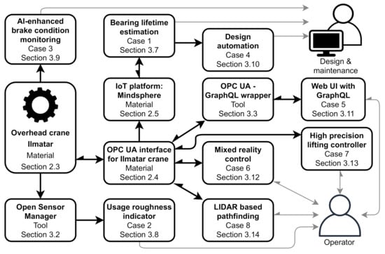 We used two research methods for this study: Participation Action Research (presented in Section 2.1) to gather data from the industry–university collaboration project, and the basic principles of Grounded Theory (Section 2.2) to draw conclusions from the data. Main materials used for the study include the overhead crane Ilmatar (Section 2.3), its data interface (Section 2.4), and an IoT platform (Section 2.5).