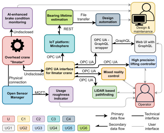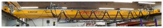 Aalto University has a full-size industrial overhead crane called “Ilmatar” (Figure 2) installed in one of its laboratory spaces [24]. The crane is manufactured by Konecranes and has several smart features such as target positioning, sway control, load floating, and snag prevention. The lifting capacity of the crane is 3200 kg, installed movement area 9.0 m by 19.8 m, and maximum speed 32 m/min. The crane is connected to the Internet, and several statistics about the use of the crane are sent to the vendor cloud and a third party IoT platform. A subset of the crane Programmable Logic Controller (PLC) system is linked to an Open Platform Communications Unified Architecture (OPC UA) server which provides a two-way (read and control) interface to crane data. The crane does not perform regular production line tasks and therefore the crane usage profile differs from its industry counterparts, having lower usage activity and seldom high-load lifts.