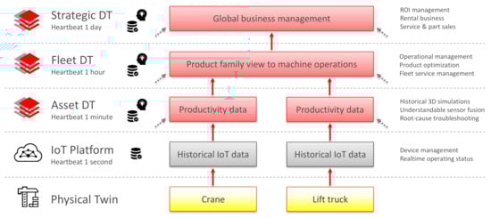 Layering is used as a way to manage the time frame of actions for different types of DTs. The physical twin operates in real-time and the layers are divided by the heartbeat of their update frequency. Data on the layers are updated in an IoT platform, asset DT, fleet DT, and strategic DT, which leverage 1 s, 1 min, 1 h, and 1 day heartbeats, respectively (Figure 3).