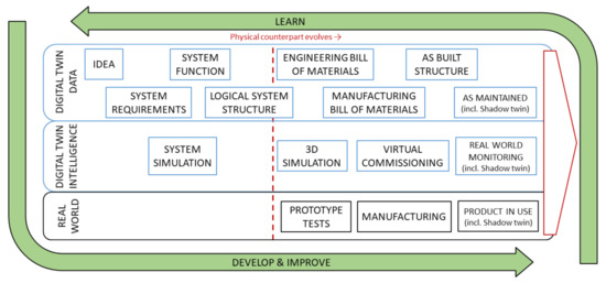 Digital twin-based product lifecycle management from product idea to product in use. The accumulating knowledge is used to develop and improve the product and to learn how to make future products better [49].