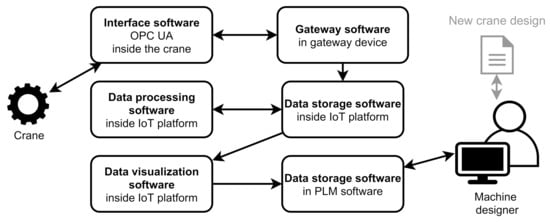 The data flow for the case travels through several technical tools: (i) the physical crane with sensors, Programmable Logic Controller, and an OPC UA server, (ii) physical IoT gateway, (iii) cloud-based IoT platform with data storage, custom engineering formulas, and web technologies (e.g., JavaScript), and (iv) a PLM system. The crane produces the raw data and provides an OPC UA interface for the IoT gateway. The gateway sends selected usage data to an IoT platform that stores the data, performs customized analysis (kinematics-based virtual sensoring and bearing lifetime calculations) on the data, as well as hosts a visualization that is displayed on a PLM system. The data flow is shown in Figure 5.