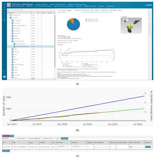 Screenshot samples of user interfaces for the bearing lifetime estimation case. (a) Product lifecycle management