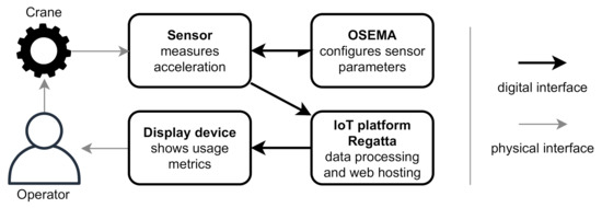 OSEMA can be used for the no-code setup of sensors and therefore enables effortless retrofitting sensors to the Ilmatar crane, aiding in data collection. After sensor installation, the manager web page can be used to change the configuration of sensor nodes, including measurement settings and network parameters, remotely over the Internet. OSEMA offers a web user interface and a Representational State Transfer (REST) API for the monitoring and management of the sensor nodes. Ilmatar was equipped with OSEMA-managed distance sensors tracking the location of the bridge and trolley. In addition, a 3-axis accelerometer was installed on the hook of the crane. This sensor was used in the usage roughness indicator application presented in Section 3.8.