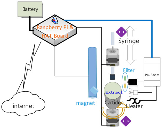 To evaluate the miniaturization of the automated DNA extraction monitoring system and the usability for portable operation, a system power supply for a portable battery power HAT board was added, along with other component control and function expansion boards, to ensure flexibility in the system hardware configuration.
