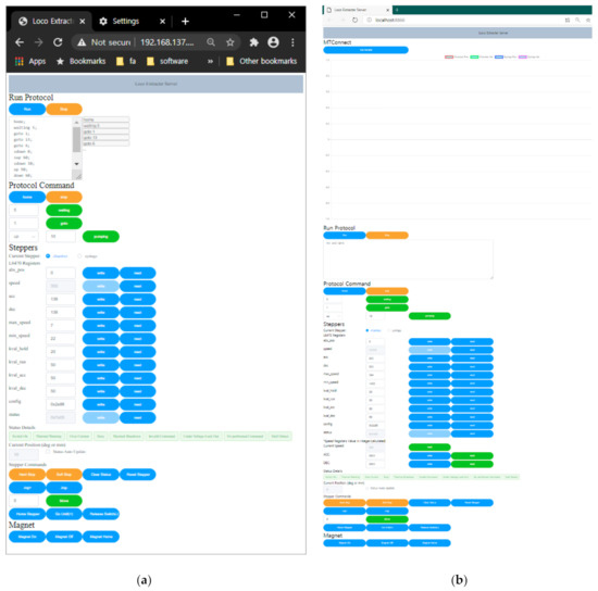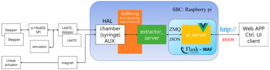 The system was implemented as a web server with Flask, and a web application-based user control UI was constructed using Vue. JS was used for two-way JavaScript Object Notation (JSON) communication with the motor drive system control driver through ZeroMQ (ZMQ) and to run the automated DNA extraction system. HTTP communication between the web application client and the web server was implemented with Axios, an Ajax library that specializes in handling only asynchronous HTTP requests. Because the web application-based user control UI configured as described above is equipped with a fully automatic system function, it is possible to perform molecular genetic diagnostic tests without specialized knowledge about genetic analysis. The automated DNA extraction system block diagram is shown in