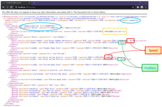 Figure 6 is an example of an instance of the collection of attribute data related to the position and speed of a specific driving unit from the MTConnect XML document.