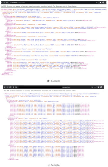3]. This makes it possible to access the status information and data on different facilities produced by various manufacturers in a standardized form outside the device. The MTConnect standard enables the implementation of a device-independent and highly scalable monitoring system because detailed information on the equipment requiring the monitoring system can be obtained in Extensible Markup Language (XML) format. As is well known, robots are embedded with sensors to allow for machine–robot or human–robot collaboration in a safe workspace of smart factories. MTConnect standard technology is applicable in the integration of components of smart factories, such as machines and robots [