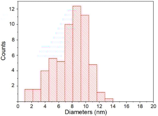 As seen from the histogram (Figure 2) the size of the rounded nanoparticles is about 8 nm and tails down to 2 nm and up to 13 nm.