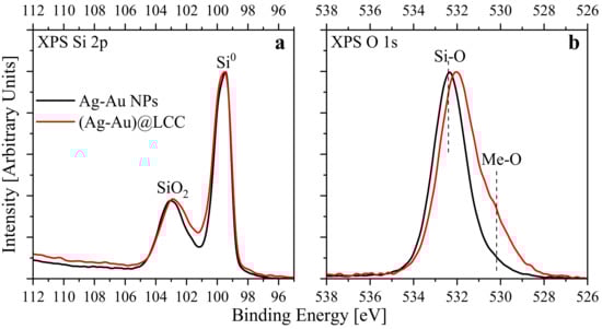 XPS spectra of Ag-Au and (Ag-Au)@LCC: (a) Si2p and (b) O 1s.