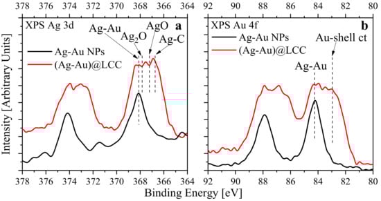 The high-energy resolved XPS Si 2p (Figure 4a) and O 1s-spectra (Figure 4b) of both samples show the main peak (in O 1s) corresponds to Si–O bond in SiO2. At the same time Si 2p spectra indicate that the main peak corresponds to Si-Si bond of substrate (99.4 eV) while the feature at 103 eV ascribed to a partial oxidation of the substrate. Further, we should note that an additional low-energy fine structure in the 528.2–531.3 eV energy range appears for (Ag-Au)@LCC. Adsorbed oxygen can contribute to spectral range near 531 eV, however, according to [,] the contributions of metal-oxygen bonds (the Ag-O and Au-O) are located at the indicated energy range. This means that a surface oxidation of both metal components in (Ag-Au)@LCC prepared by laser ablation in water could take place. To check this conclusion the high-energy resolved XPS Ag 3d and Au 4f spectra were analyzed (see Figure 5a,b).