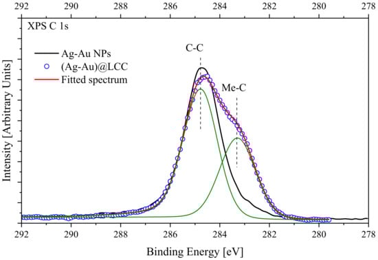 The XPS core-level and valence band (VB) measurements were performed using a PHI 5000 Versa Probe XPS spectrometer (ULVAC Physical Electronics, Chanhassen, MN, USA) based on a classic X-ray optic scheme with a hemispherical quartz monochromator and an energy analyzer working in the range of binding energies from 0 to 1500 eV. This equipment uses electrostatic focusing and magnetic screening to achieve an energy resolution of ΔE ≤ 0.5 eV for Al Kα radiation (1486.6 eV). Pumping of analytical chamber was carried out using an ion pump providing pressure better than 10−7 Pa. The XPS spectra were recorded using Al Kα X-ray emission; the spot size was 200 μm, and the X-ray power load delivered to the sample was less than 50 W. Typical signal-to-noise ratios were greater than 10,000:3. XPS spectra were processed using MultiPak 9.9.0.8 software. Finally, the background was taken into account using the Shirley method. A few drops from the nanoparticle suspension was deposited and dried on a monocrystalline silicon substrate to record XPS of the core-levels and valence bands. The presence of metal-carbon bonds is of crucial importance in the solid state analysis since free sp chains air-exposed easily degrade as a consequence of their interaction with atmospheric gases []. Thus, we are confident that the obtained LCC species on (Ag-Au) nanoparticles are stable and suitable for XPS analysis.