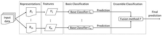 General structure of a classification model using different features V of representations R of input data for an ensemble of n base classifiers C merged by a fusion method F.