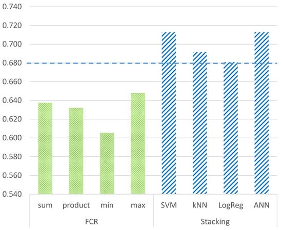 Furthermore, the well-studied fusion of different classifiers promises improved performance results especially when the diversity of the base classifiers is high []. A plethora of fusion methods, e.g., rule-based approaches such as summing and averaging, or stacking with machine leaning algorithms acting as fusion classifiers, are available to customize ensemble classification systems to specific tasks.