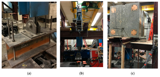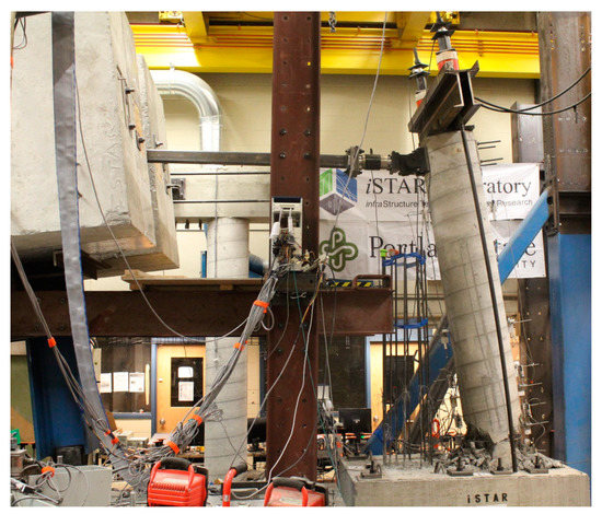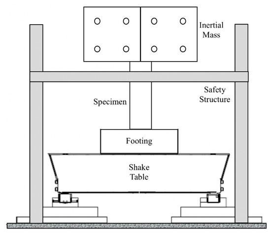 Several shake table experiments on cantilever RC columns have been performed by positioning the inertial mass directly on top of the specimen’s head and subjecting it to the earthquake ground motion record. Examples of such studies can be found in the works by Mosalam et al. [12], Sakai et al. [13], Schoettler et al. [6], and Ge et al. [14]. In this configuration, the axial force on the column model generated by the superstructure weight and the P-Δ effect can be replicated. While this procedure has been widely used, there are major deficiencies associated with it. One of the key disadvantages of this setup is that its arrangement leads to delays and higher costs due to mass removal and reinstallation when the experimental program consists of several specimens. Furthermore, an auxiliary-supporting system must be considered for protection during and after testing in the case of large displacements or a possible collapse of the specimen. Figure 2 and Figure 3 show two setups where the inertial mass is directly on top of the test specimen.