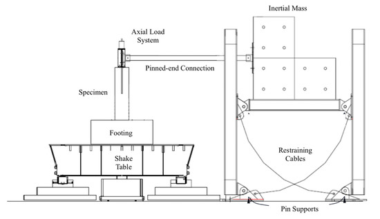 In the literature, three types of mass-rig system placed outside the shake table can be distinguished: a linear sliding, a rotational, and a pendulum system. Among these systems, the rotational mass-rig has been used in experiments involving RC columns as the specimen, as proposed by Laplace et al. [15]. This mass-rig system is presented in Figure 4 and consists of an articulated frame to provide the inertial loading during the testing program. The axial force applied to the column is accomplished by means of a steel spreader beam connected to the top of the specimen’s head and two center-hole jacks. To restrict the translation of the inertial mass, constraint cables must be included. In the case of column failure, the mass-rig translates until reaching the maximum displacement preset by the restraining cables. Thus, safety concerns are eliminated if the specimen fails. Furthermore, the mass-rig restrains the out-of-plane movement of the specimen and, therefore, additional elements for this purpose are not necessary. Another benefit of this mass-rig configuration, as indicated above, is that it also enables quick installation and removal of specimens.