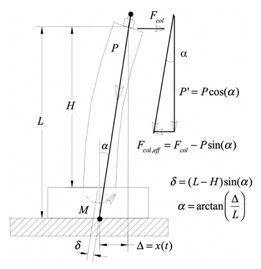 From Equation (12), although α depends on L, which is larger than H, this angle is small; accordingly, δ is also small. Hence, it is reasonable to say that the inertial mass effective weight (W″) is equal to the applied axial load, and consequently, the equivalent lateral force due to the overturning moment from the IMS and the restoring force of the posttensioning bar may cancel out. Furthermore, since α is typically small, P′ ≈ P and, therefore, the proposed IMS reproduces the P-Δ effects very similar to the expected results as if the mass is placed directly on top of the column’s head.