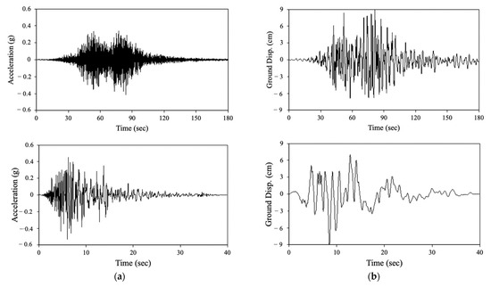 Time histories for the Curico X (top) and Capitola X record (bottom): (a) Acceleration; (b) Displacement.