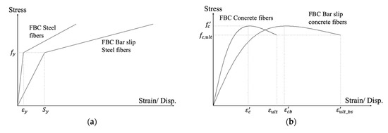 To improve the prediction of column deformation, shear and bond-slip behavior must be included in the model. Shear deformation is ignored with a standard fiber beam-column element approach, which only provides flexural behavior. Additional flexibility from shear behavior is added to the cross-sections at the column-footing interface using a section aggregator. The shear behavior is assumed as an isotropic material with a constant shear modulus, Geff, equal to 0.2Ec, as recommended by Elwood and Eberhard [22]. Similarly, the conventional fiber beam-column element strategy neglects the added flexibility from the slip of the longitudinal reinforcement at the anchorage because it assumes a complete bond between the concrete and steel. The bond-slip behavior is modeled following the model proposed by Ghannoum [23] and the recommendations of Mehary et al. [24]. In this model, the slip behavior is represented using a zero-length fiber segment with the same discretization scheme used for the force-based beam-column element. However, this model replaces the stress-strain relationships in the zero-length section by an analogous stress-slip relationship for the steel and concrete fibers, as shown in Figure 13. The slip displacement at yield (Sy) in the steel fibers can be determined from the measurements of the linear variable differential transformers (LVDTs) located at the column base. For the purpose of comparing the three systems, a value of 0.76 mm for the slip displacement at yield is used in the distributed plasticity model based on the experimental results reported in Lopez et al. [9]. The steel fibers in the bond-slip zero-length element are modeled using the Giuffre–Menegotto–Pinto model because of its easy implementation. The same uniaxial concrete material model used in the concrete fiber section was adopted for the confined and unconfined concrete in the bond-slip zero-length element. To prevent discontinuities in the steel stresses and neutral axis location between the fibers of the non-linear beam/column element and the bond-slip section [23], the strains in this section were also modified. This adjustment was achieved by applying a scale factor of to the concrete strains. Although this scale factor is dimensionally incorrect, it increases the concrete strains to preserve consistency with the fiber sections. A scale factor of 17 is used for the analysis.