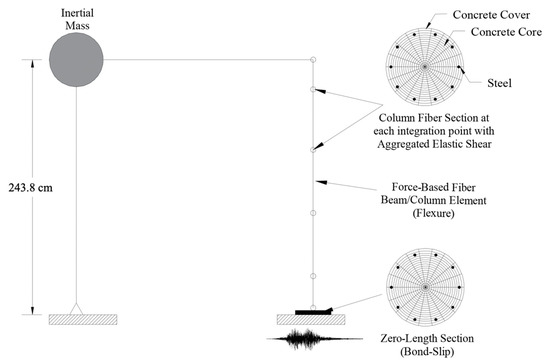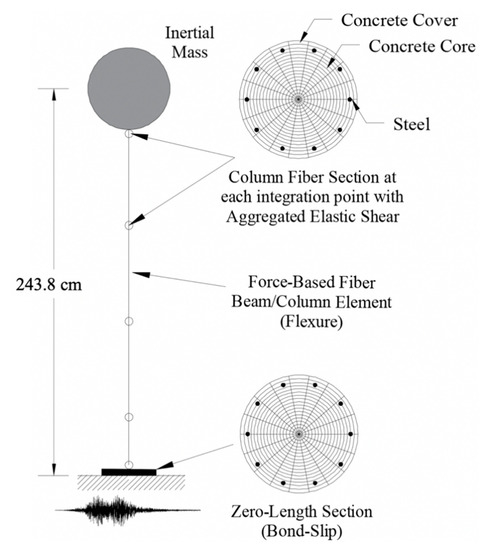 As mentioned previously, the proposed IMS is part of the experimental program presented in Lopez et al. [9] and depicted in Figure 5. In general, the test setup includes the IMS, an RC column, an axial load system, and a shake table system. The numerical model of the proposed setup presented in this study is illustrated in Figure 12. The RC column is modeled using the fiber-based distributed plasticity model formulation proposed by Taucer et al. [17]. In this strategy, the column is represented using a force-based beam-column element with distributed plasticity, where yielding is allowed at any integration point along the element length [20]. The modeling strategy was calibrated with the experimental results reported in Lopez et al. [9]. The chosen modeling strategy incorporates a force-based fiber beam-column element, a zero-length bond segment, and an elastic shear component to model the flexural, bond-slip, and shear components of the total column deflection. A force-based beam-column element with five integration points is used to describe the column, following the strategy used by Berry and Eberhard [19]. Since most non-linear behavior occurs near column base, the Gauss–Lobatto integration scheme is used as the plastic hinge integration method.