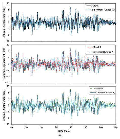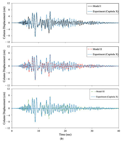 Non-linear time-history analysis (NLTHA) was performed in OpenSees [10] to compare the performance of the three systems. The input ground motions for the analyses were chosen from the Maule, Chile, M8.8 earthquake, and the Loma Prieta, M6.9 earthquake. For this purpose, the transverse direction of the ground motion recorded at the Curico station (Curico X) was considered from the former earthquake event, and the ground motion recorded at the Capitola station (Capitola X) was considered from the latter event. The Curico X record was amplified using a factor of 1.57, whereas the Capitola X record was kept the same, as it was considered in the experimental program. Details of the scale factors used are discussed in Lopez et al. [9] and are not presented here since this study aims to compare the performance of different inertial mass configurations. Figure 11 depicts the original acceleration and integrated displacement histories of the Curico and Capitola records used for the NLTHA. It is worth mentioning that the representation of the earthquake input was the same for all the numerical models and base on the base displacement shown in Figure 11b. Using the displacement histories of the records instead of the acceleration histories was to keep consistency in the input motion applied to the numerical models. While the input time history is applied directly to the column specimen in Model I and Model II, in Model III the ground motion is only applied to the column model. To keep consistency in the modeling approach, OpenSees allows applying the ground motion history to specific nodes in the model by employing the command multisupport excitation pattern, which applies a displacement ground motion. When using this command, the input motion can be an acceleration or displacement time history. If using the acceleration record as input, OpenSees automatically integrates the record to obtain the displacement record. However, it is recommended that the user input the displacement since the program’s integration method is not accurate. Therefore, the displacement time histories are shown in Figure 11b are applied to each numerical model.