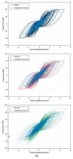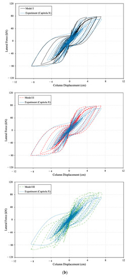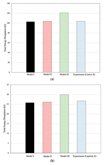 Figure 18 presents the total experimental dissipated energy contrasted to those obtained from the numerical models. The total energy dissipated was computed by summing the enclosed area from each cycle of the force-displacement hysteresis curve. Model III tends to overestimate the cumulative energy dissipated by the specimen by approximately 16% and 12% for the Curico X and the Capitola X records, respectively. This overestimation is primarily caused by the secondary moments (P-Δ effects) that the mass-rig transferred to the column. In contrast, Models I and II present a negligible overestimation in the total dissipated energy, with errors of 0.87% and 0.31% for the Curico X record, and 3% and 2% for the Capitola X record, respectively.